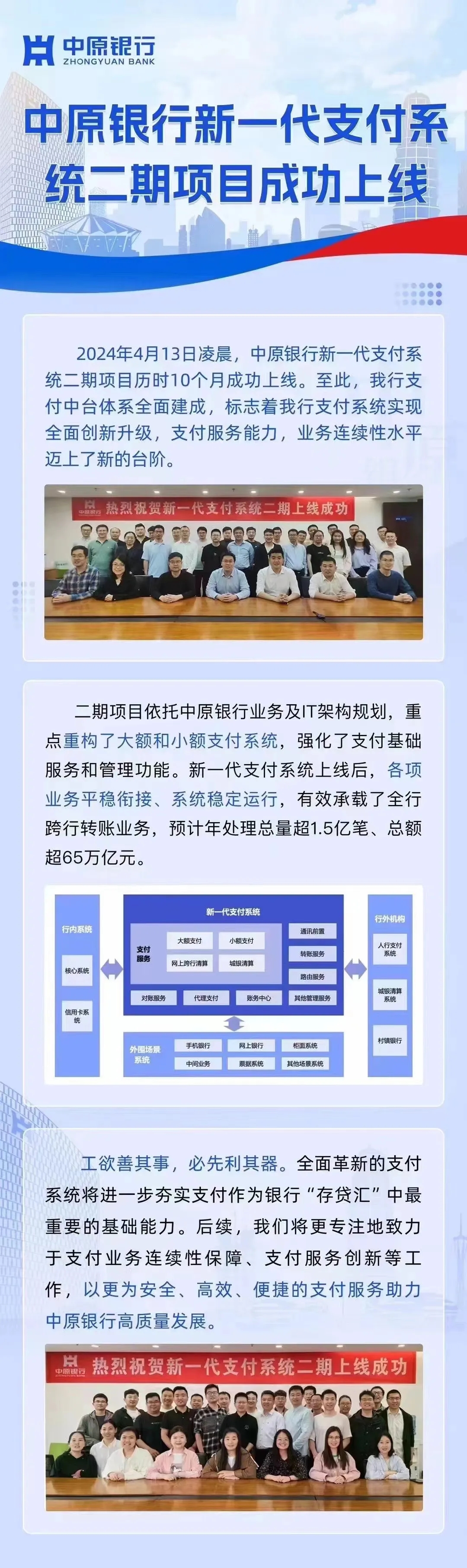 热烈祝贺中原银行新一代支付系统(二期)项目成功上线